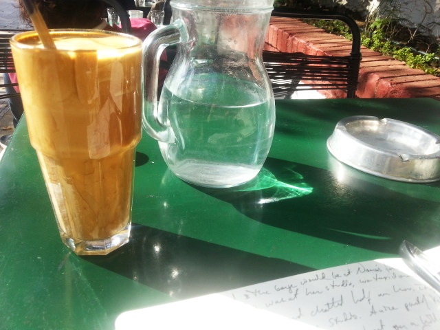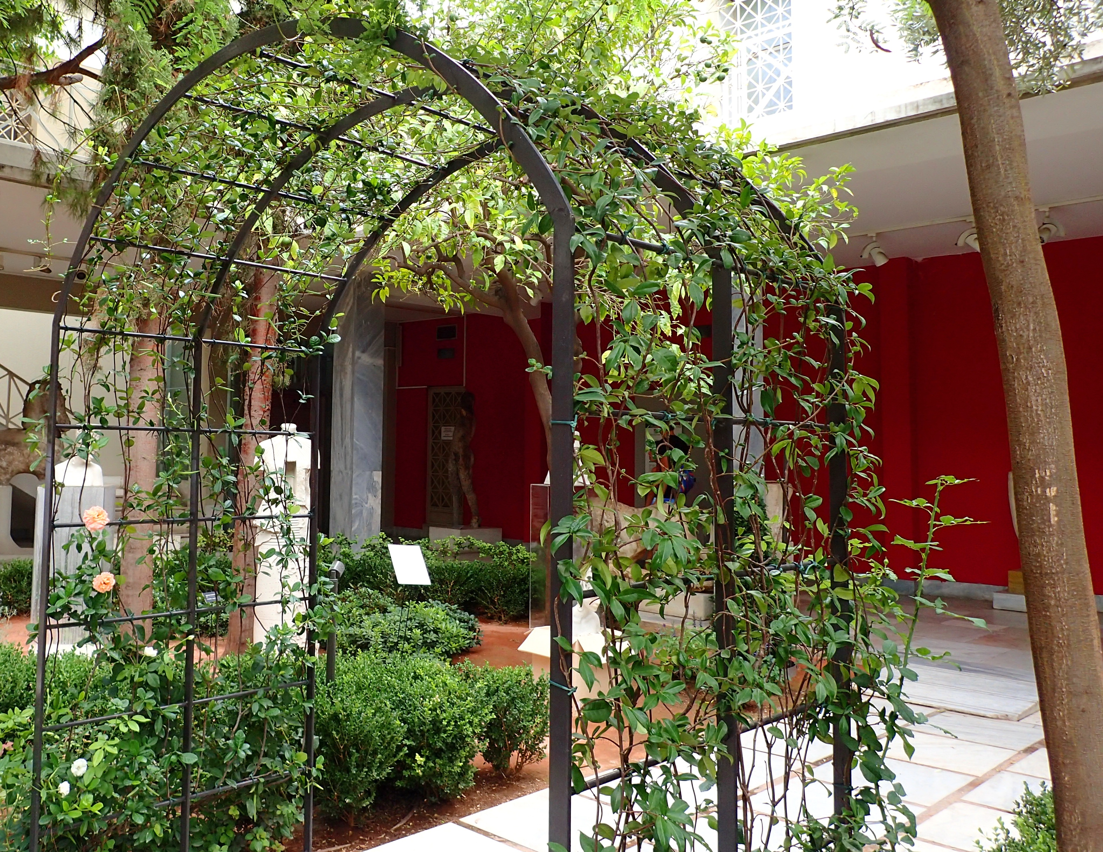 The Cycladic Museum, the Benaki, and the B & M Theocharakis foundation for the Fine Arts and Music have their own fine cafes, But the cafe in the National Garden’s quiet northeastern corner offers a refuge for the mind. It’s the perfect place to let your impressions of the exhibition settle. The prices are high and the service is average. The coffee absolutely is nothing special by Athenian standards. None of this matters. Here in the very heart of downtown, steps from the presidential mansion and Vasilissis Sophias Avenue, you find silence- deep green, shady silence, with a few sparrows. The tables are marble, the classic cafe chairs and canopy green painted metal, nestled in white gravel. Vines trail everywhere. It’s Athens’ most Parisian corner. Even on the hottest day you feel cool just looking out into the unrestrained greenery at your table’s edge. There is no music- just conversation flowing like a brook.