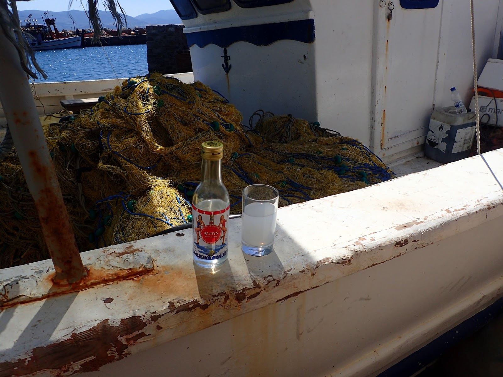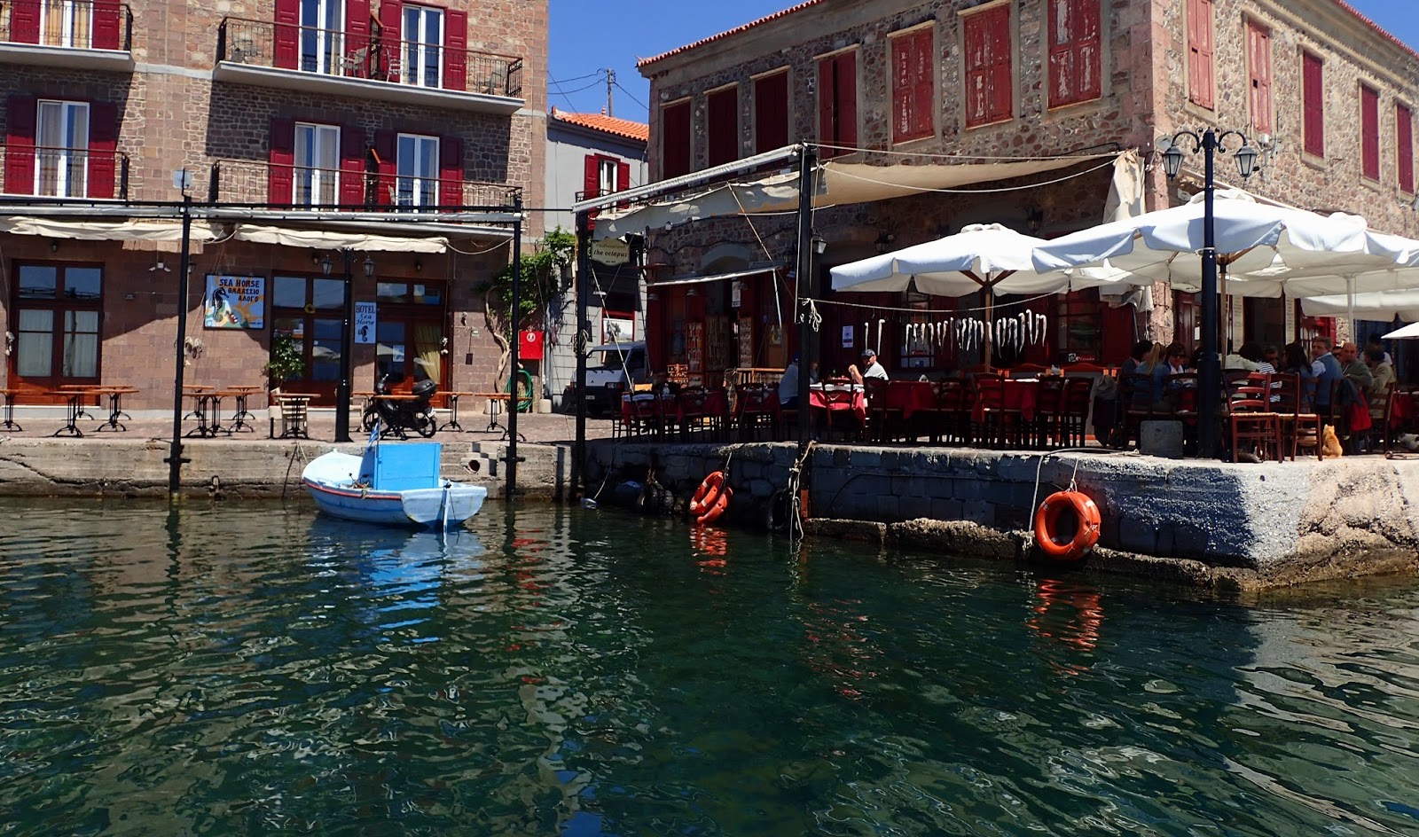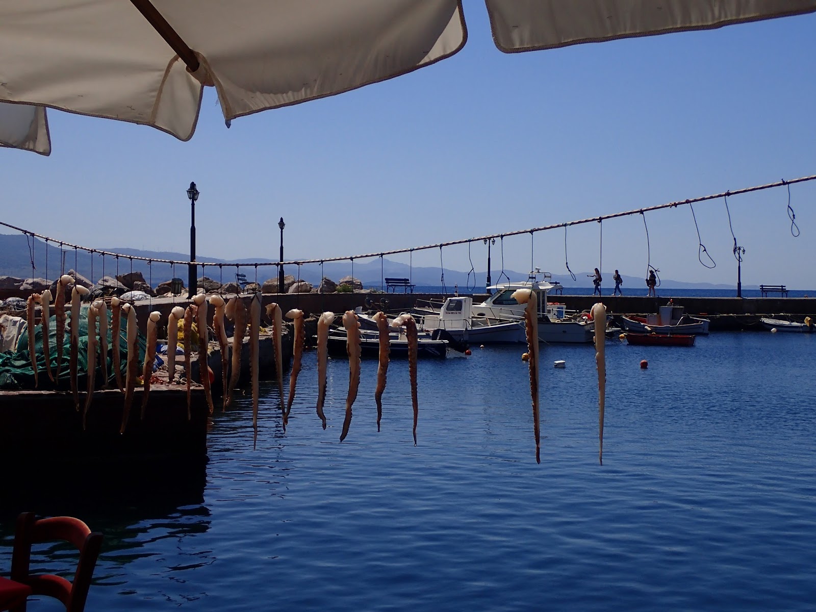 Nothing like the sea to make you hungry. We dock at the promisingly named “Octopus” which has octopus hanging right outside, which we have with ouzo, which is essentially a sunny Lesvos afternoon in a glass. (more about ouzo here).