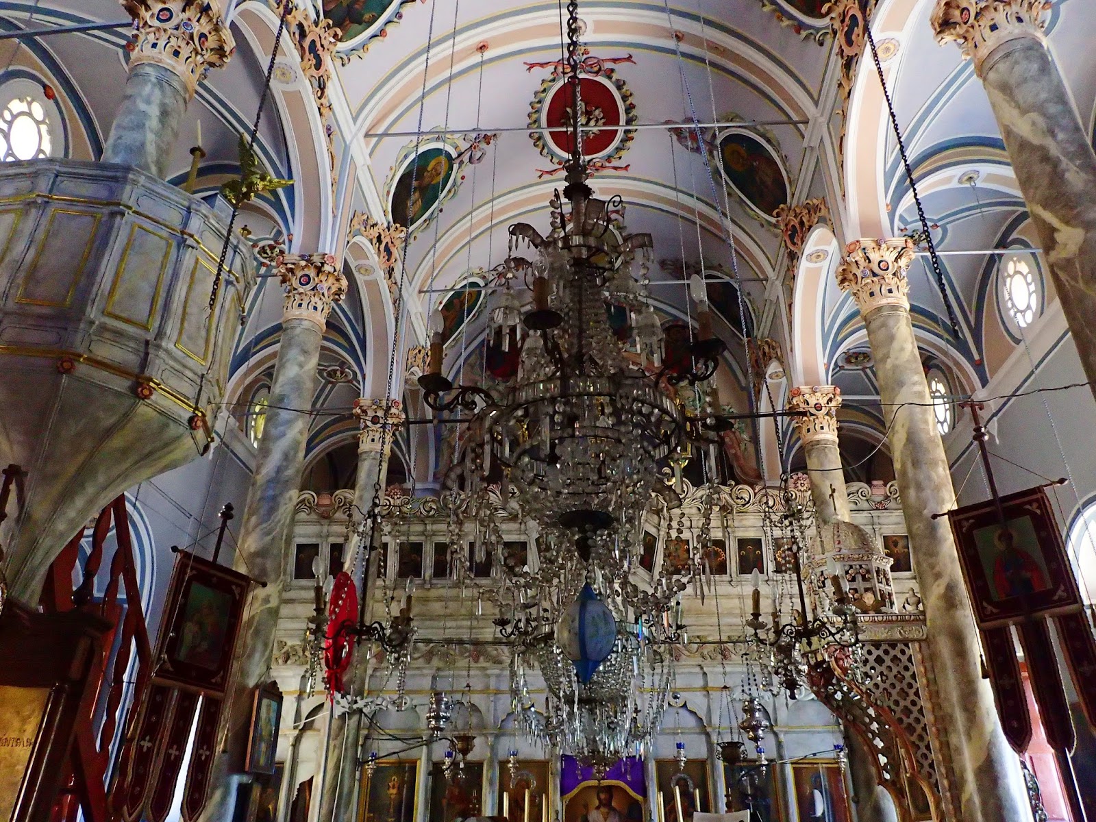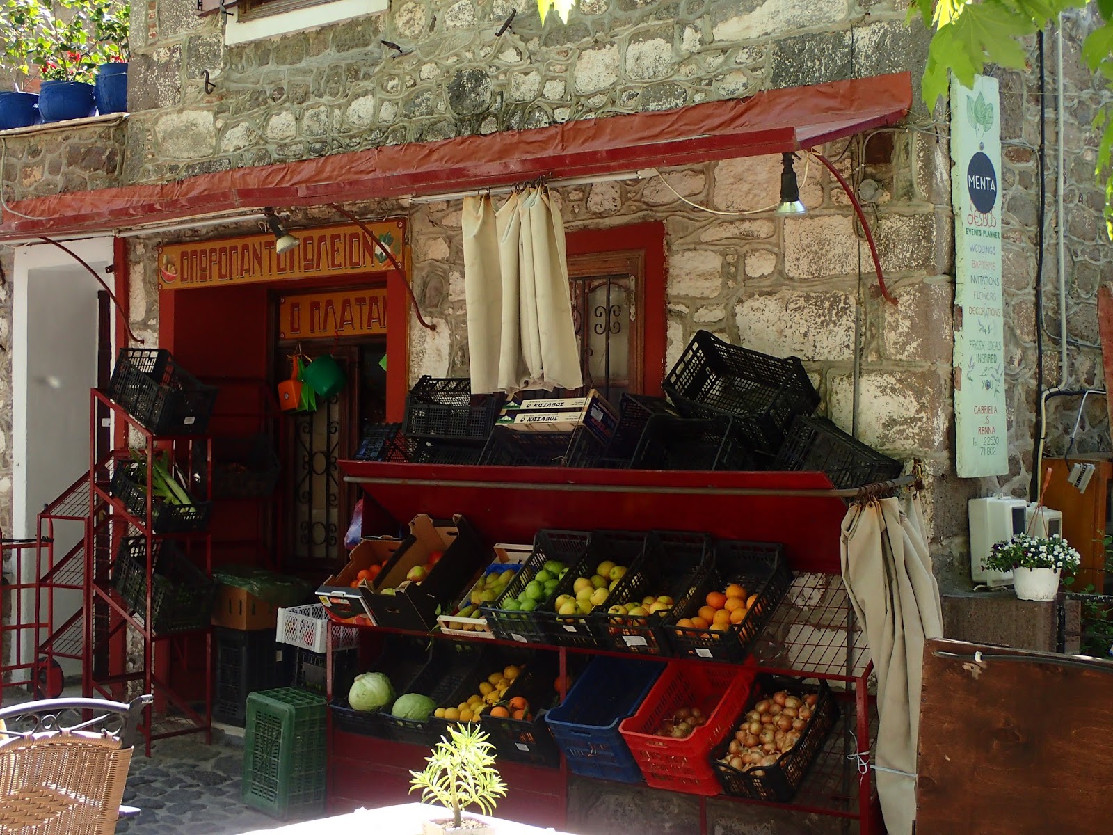 Then we go the main plateia (“square”), shaded by a huge Plane tree, and circled with grand houses, Gabriela’s florist shop, and a supermarket (island style)