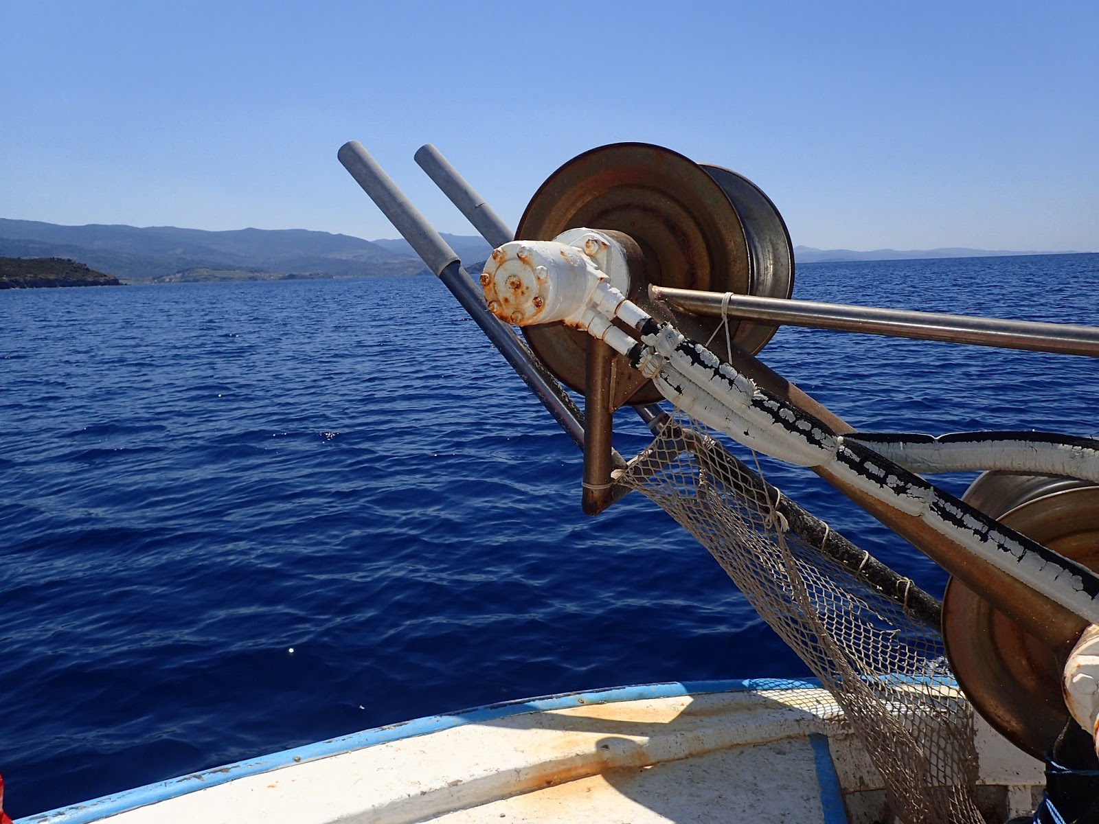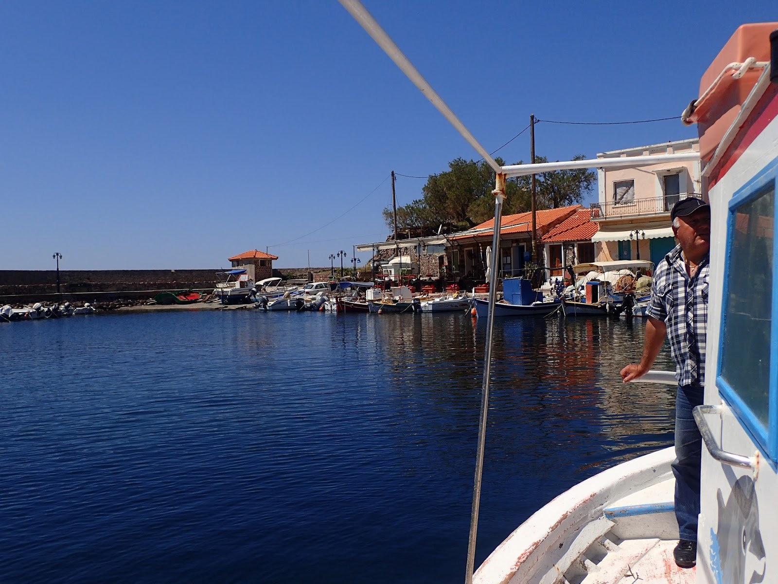 (The florist shop, the mansion you can stay in, the views, if this puts you in mind of getting married, Gabriela can arrange everything- she has started Menta Weddings for the people who come from all over to celebrate here, the most beautiful place they have ever been). Gabriela tells us about her beautiful town as we go down the hill. We are at a harbor, and it is all charm. If the sun in Molyvos had a flavor it would be sweet. It sugarcoats every surface- the cobblestones, fishing boats, sparkling sea, your shoulders. You forget what it was ever like to be cold. The sea is turquoise at the small beach, but even here at the harbor- deeper teal- you can make out every stone on the seafloor, each school of fish. The fishing boats are brightly painted, each its own way, and named. They strike the perfect balance between story-book and serious work- the fanciful colors, nets neatly bundled.