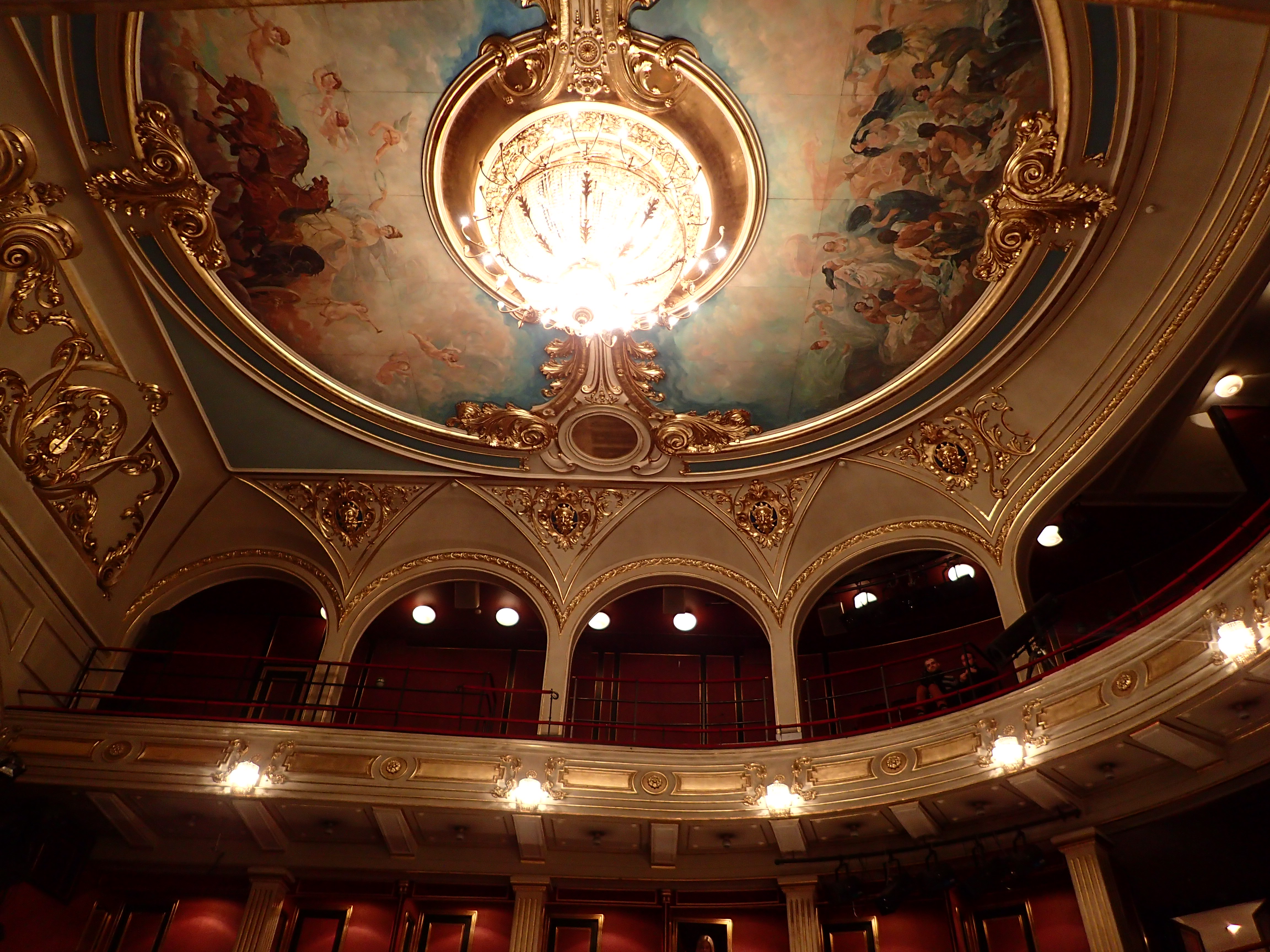 We went 15 minutes early (our opera was a long one, with a 19:30 curtain). Ushers are volunteers and are not customarily tipped. It’s worth going early to enjoy the room- it’s everything you hope for in a Baroque style opera house in a European capital, from the angels on the gilded ceiling to the cushioned balustrades covered in Bordeaux velvet. As the performance stretches on, people rest their arms on them with their chins in their hands like little children.