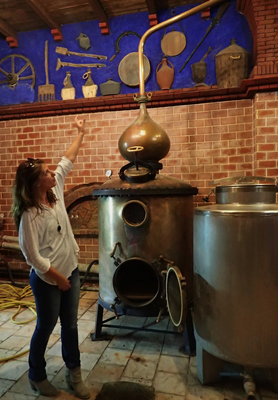 in which the the product to be distilled- here the alcohol and the aromatics (in other cases say fermented mashed grapes for grappa)- are placed on the bottom, then steam condenses in the onion shaped dome above, and is transferred to the tank. In this case, the alcohol is definitely not from grapes; alcohol from grain or sugar beets is preferred for its neutrality. Eleni explains: