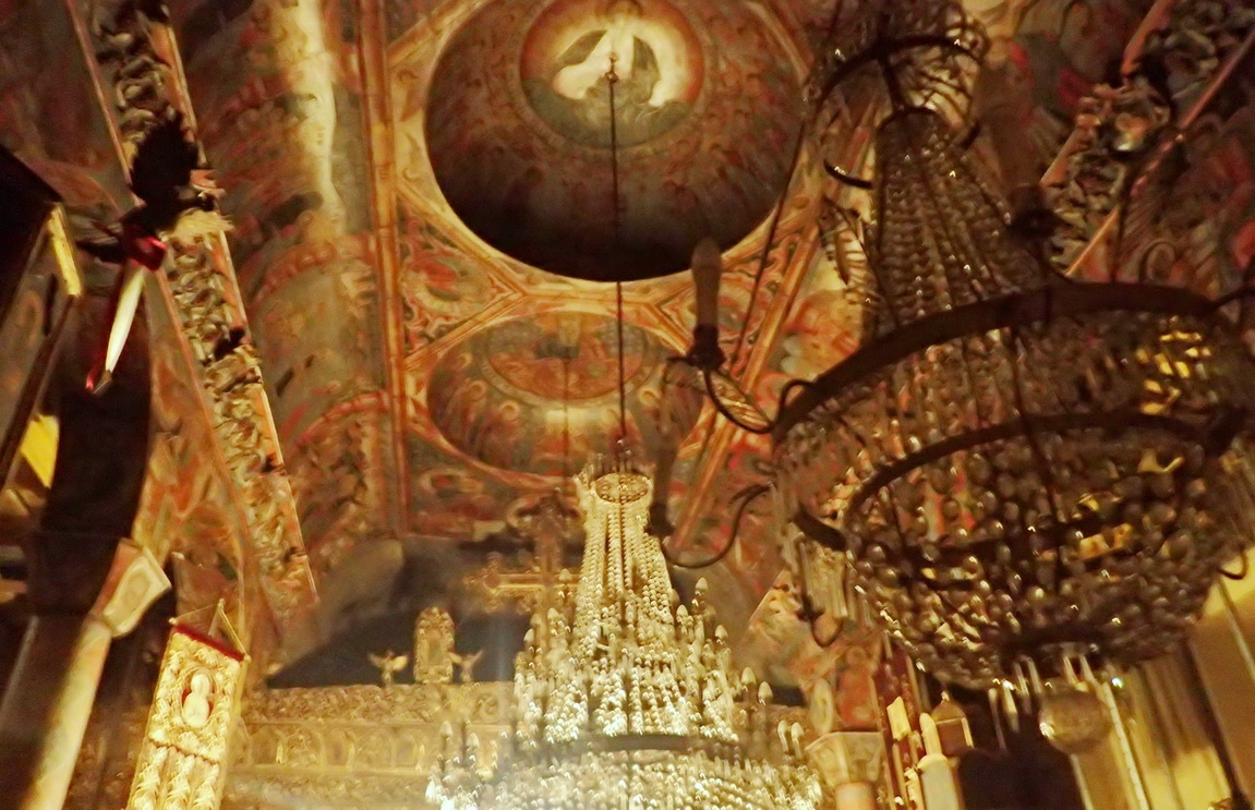 We had an excellent tour of the Church of the Archangel, built in the early 18th century. The interior the work of a single monk from Mt. Athos, who took 33 years (as the life of Christ) to paint it. However, no one saw these for long time. This is because years of soot had covered the frescoes almost entirely in blackness. An earthquake had revealed the genius of an underground acoustic system.