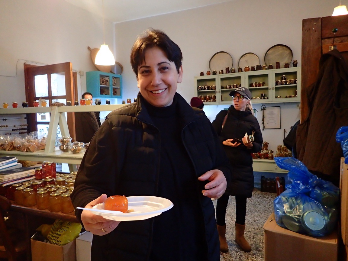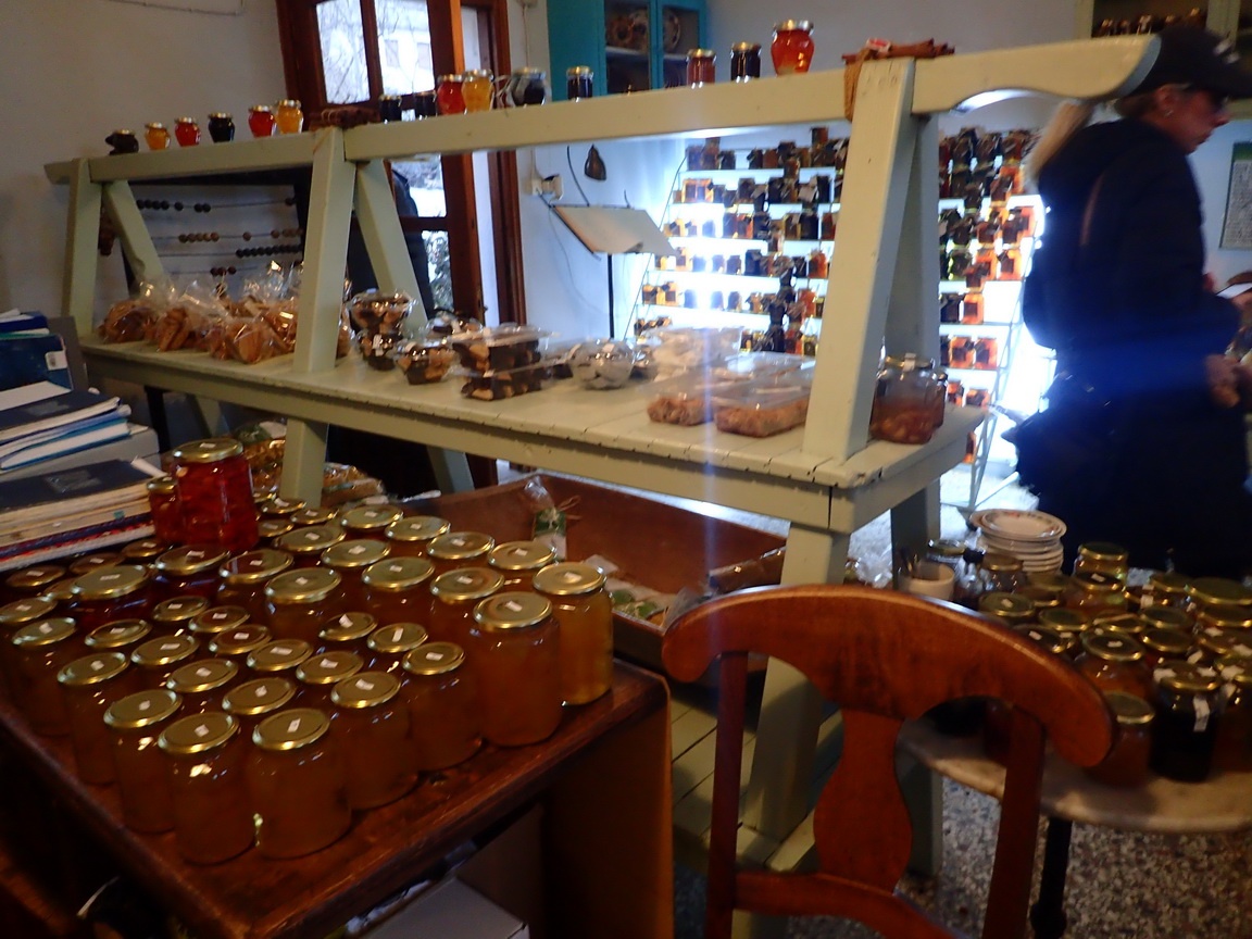 Womens’ cooperatives are a beautiful and essential part of traditional Greek life. In fact, they preserve traditional Greek life. Women of rural regions form their own organizations to preserve recipes and local food ways. These collectives are museums of edible culture, preserving taste memories and delicate skills. Vizitsa’s cooperative started five years ago- local women invested their own money to create a workshop and kitchen where you can take lessons and shop for local handcrafted foods, like the “glyko koutaliou”- spoon sweet- made with local fruit.